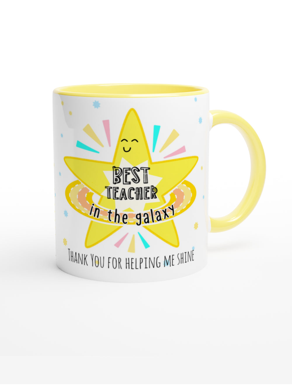 Celebrate the incredible educators in your life with our Best Teacher in the Galaxy Star Mug. This vibrant 11oz mug, featuring a cheerful yellow interior and handle, is sure to brighten any teacher's day. Perfect for enjoying hot drinks and holding those forgotten cups of cold tea or coffee.
