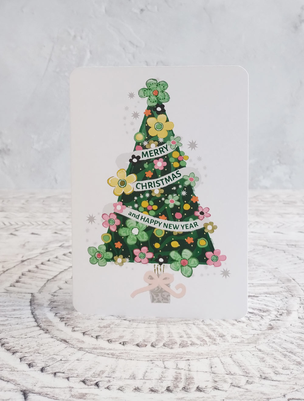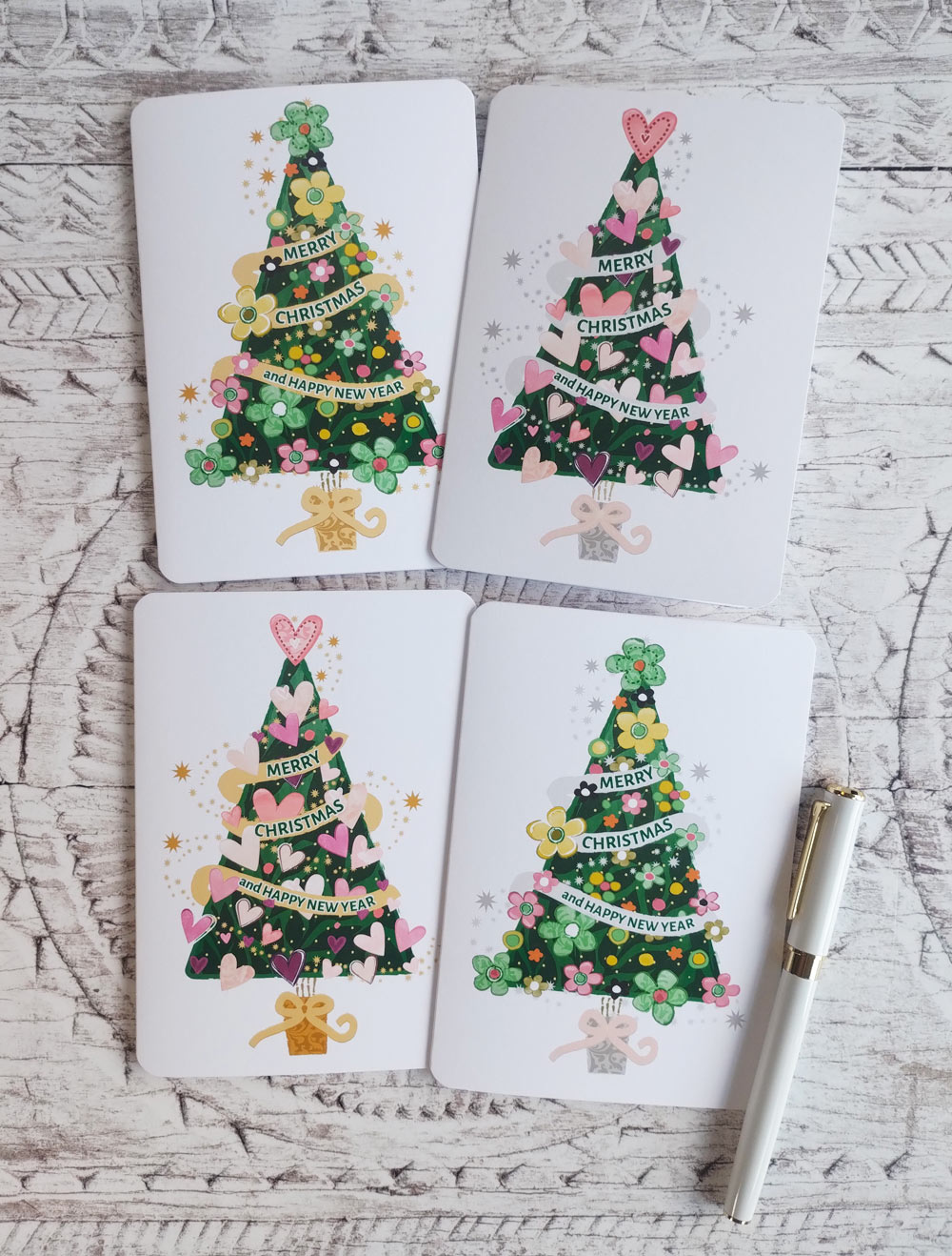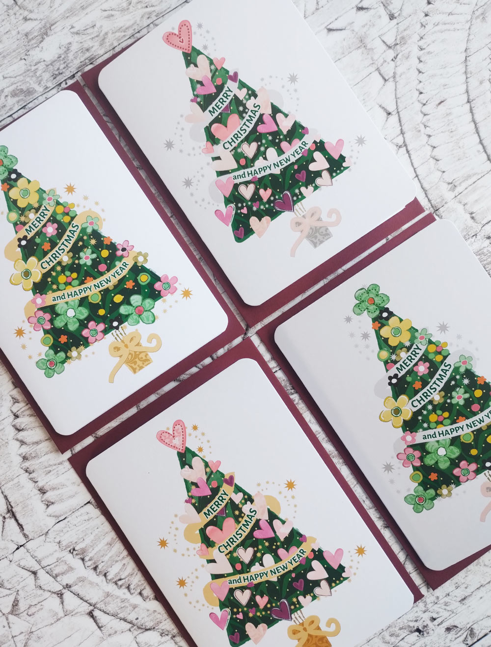 Pack of 4 colourful Christmas cards featuring trees and wreaths