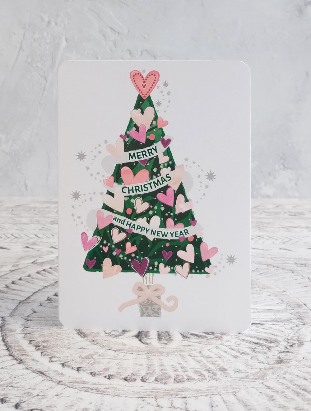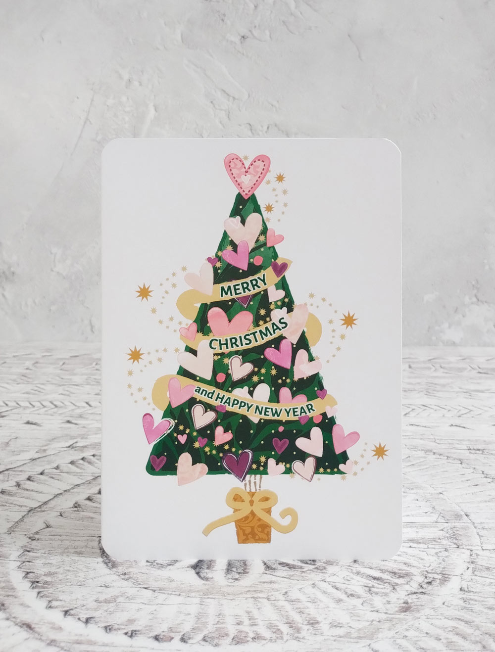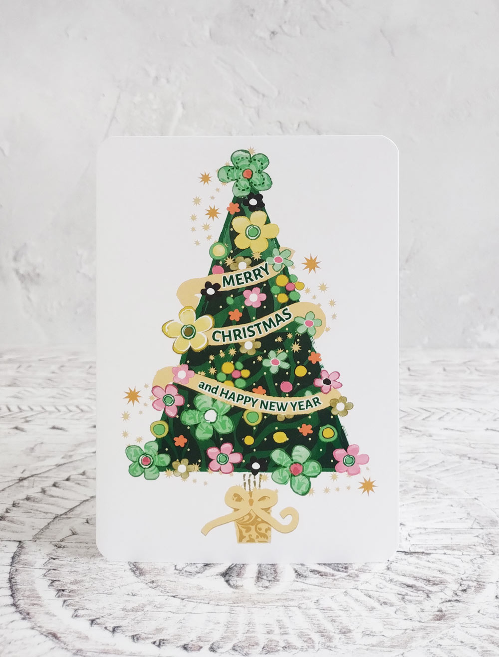 Pack of 4 colourful Christmas cards featuring trees and wreaths