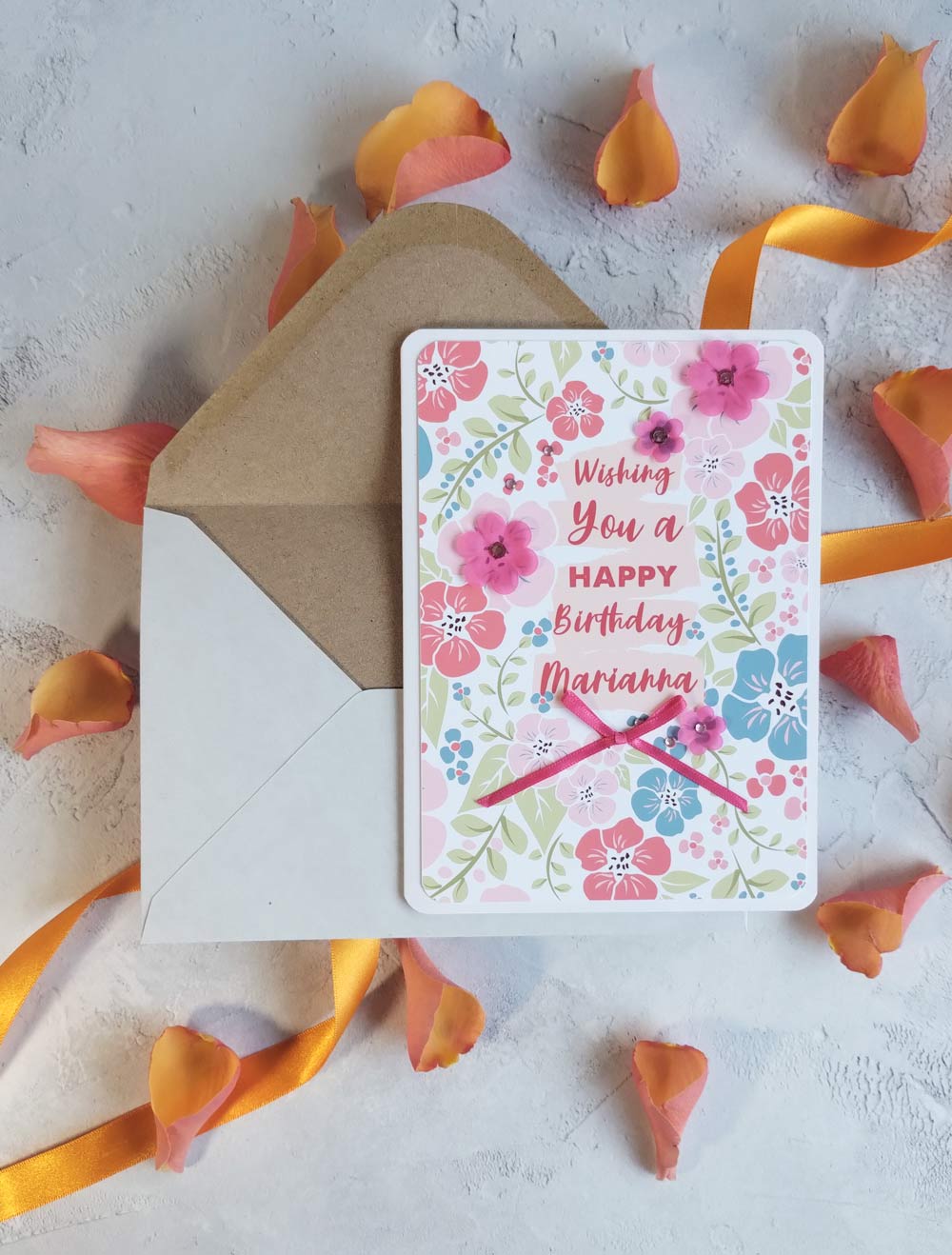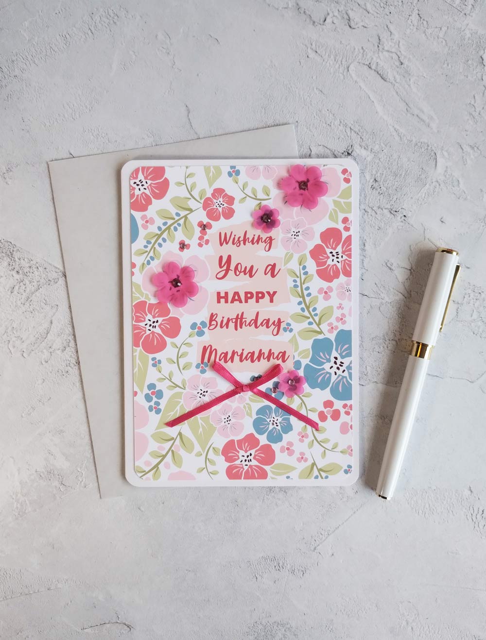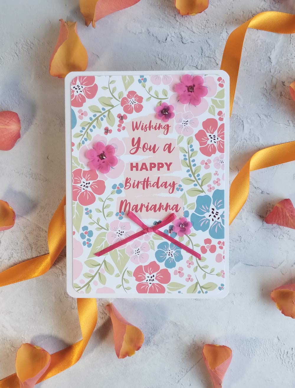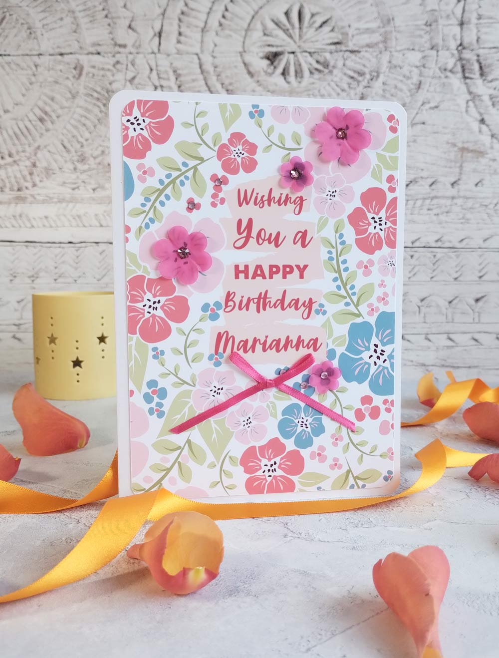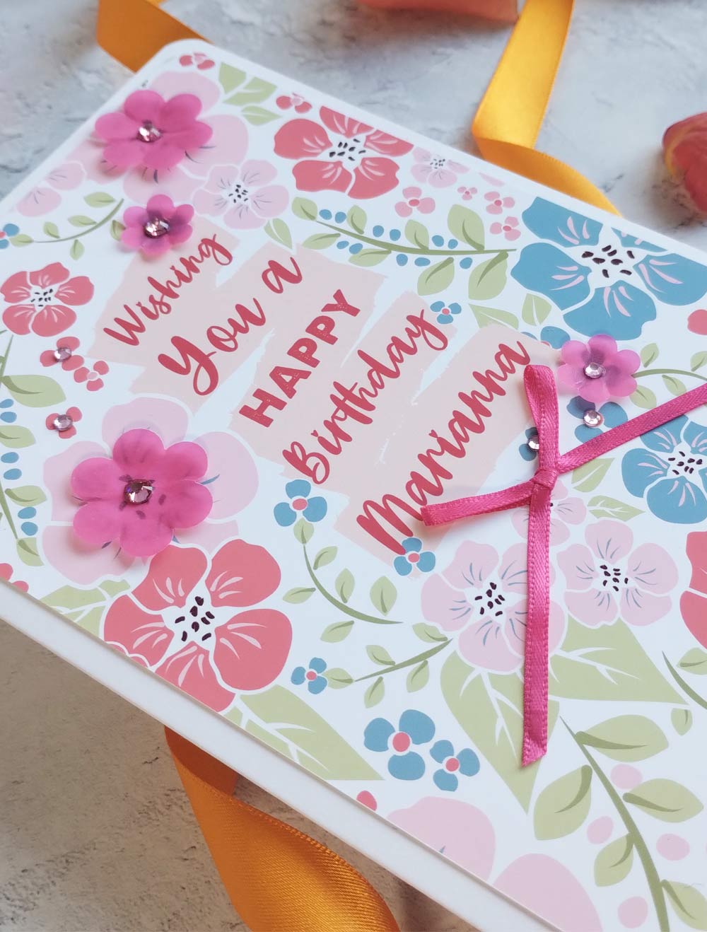 Featuring bright, eye-catching blossoms, delicate pink vellum cut-out flowers with sparkling diamante centers, and a beautifully hand-tied pink bow. The perfect way to send your love and best wishes.