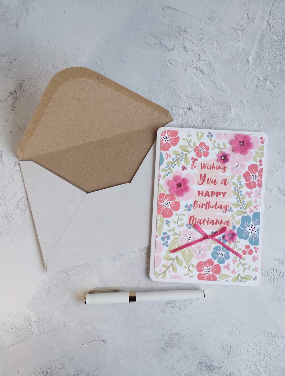 This card comes with a high-quality recycled envelope that is natural white on the outside and reveals flecked kraft on the inside when opened.