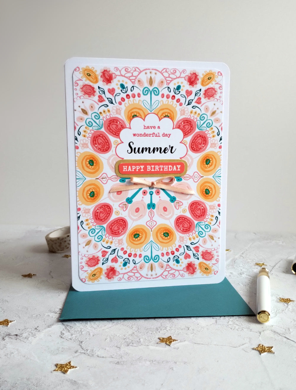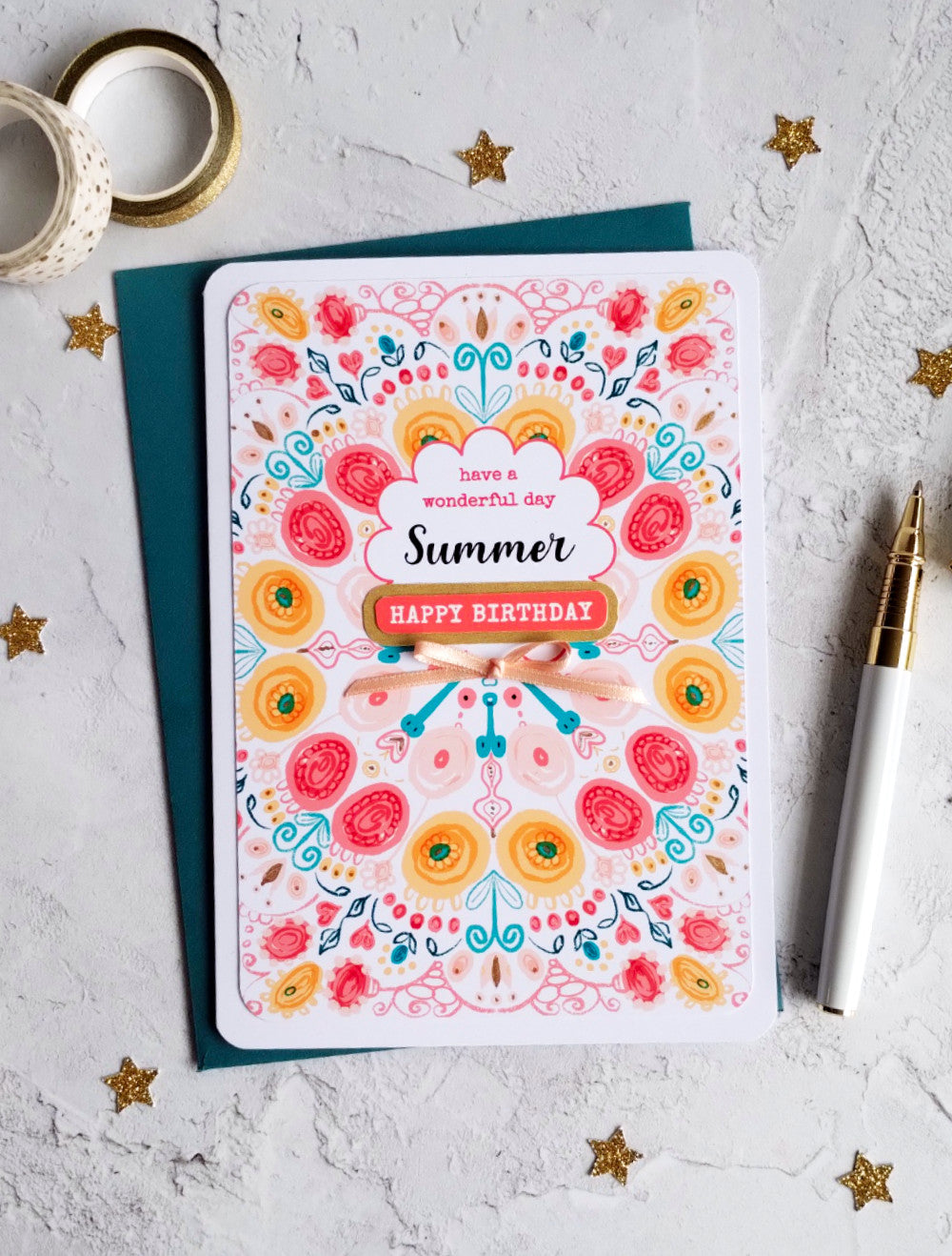 Featuring a bright, hand drawn pattern, hand-painted gold accents and a satin hand-tied pink bow. The perfect way to send your love and best wishes.
