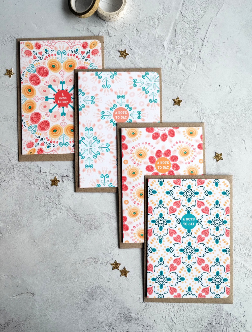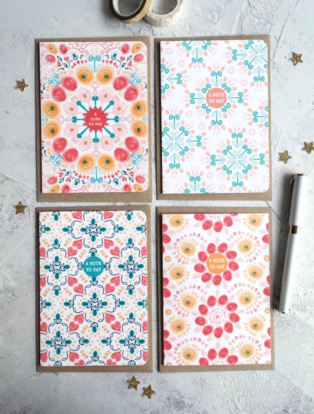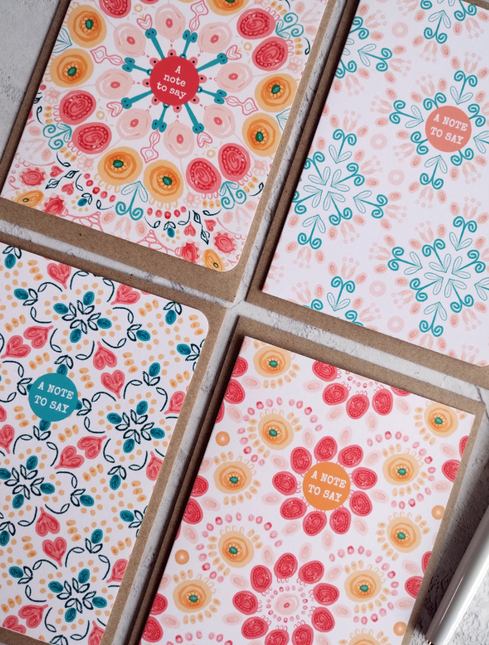 Bring the joy of summer to your handwritten notes with this vibrant pack of 4 Summa Mixed design note cards. Inspired by the warmth, colour, and energy of the season, each card features a colourful pattern to brighten someone’s day. Whether you're saying thank you, sending love, or simply keeping in touch, these cards are perfect for your messages.