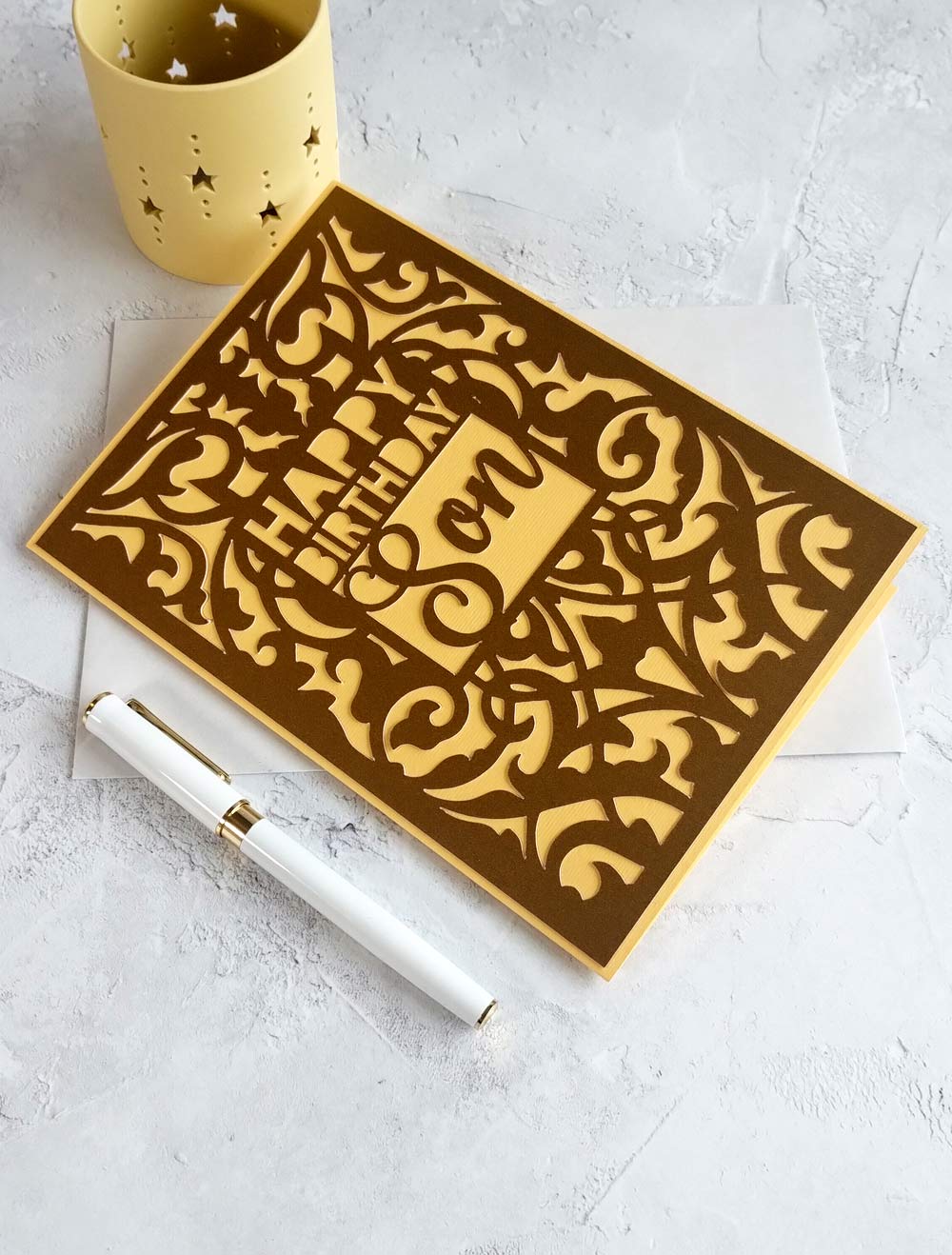 The yellow linen backing card has an Antique Gold Pearl cutout layer with the birthday message nestled in a filigree pattern.